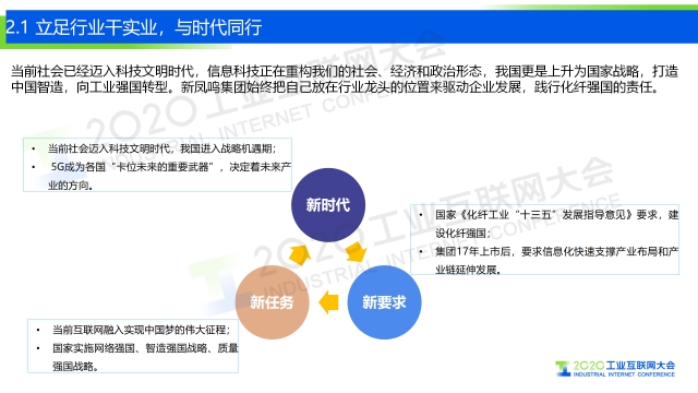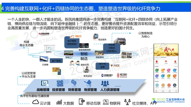 專家說 “在5G的加持下,新鳳鳴構建了集成基礎數據、實時數據、ERP、MES、大數據及商務智能、APP和標識解析于一體的工業互聯網平臺,形成智能+辦公、智能+物流、智能+銷售、智能+決策、智能+生產、智能+運營的十大應用,一體化打通集團的業務鏈、數據鏈和決策鏈,實現與內外部的互聯互通,支撐企業向上拓展產業鏈,橫向打通供應與物流鏈,向下延伸金融與服務鏈,用平臺的先進性支撐和保持我們企業高速發展、創新發展、高質量發展。” 以下是演講PPT 敬請閱讀