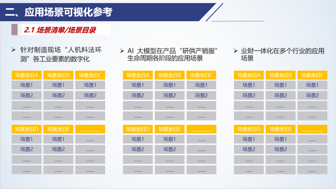 常用的場景菜單包括:針對制造現場“人機料法環測”各工業要素的數字化、AI大模型在產品“研供產銷服”生命周期各階段的應用場景、業財一體化在多個行業的應用場景。