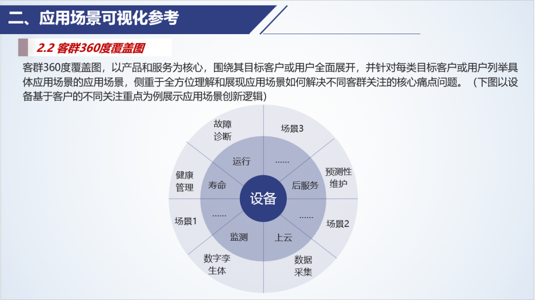 以產品和服務為核心,圍繞其目標客戶或用戶全面展開,并針對每類目標客戶或用戶列舉具體應用場景的應用場景地圖,可以稱為“產品/服務中心的客群360度覆蓋地圖”,此地圖側重于全方位理解和展現產品或服務如何在不同客戶群體的生活或工作中發揮作用。
