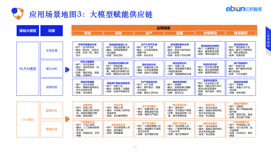 技術賦能圖示例:億邦智庫梳理的大模型賦能供應鏈的應用場景地圖以大模型技術和供應鏈環節兩個維度展開,助力大模型供應商向鏈主企業、或供應鏈平臺等,一圖展示全景服務能力,客戶方一圖通覽全局,按圖選擇切入點。
