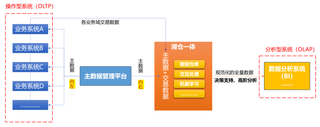 目前主數(shù)據(jù)管理平臺承擔著一種比較特殊的角色,介于數(shù)據(jù)交易側(cè)和數(shù)據(jù)分析側(cè)之間,兼具源頭業(yè)務(wù)IT系統(tǒng)和數(shù)據(jù)倉庫等平臺的特點。當主數(shù)據(jù)管理系統(tǒng)作為數(shù)據(jù)記錄的產(chǎn)生源頭,承擔著共性業(yè)務(wù)流程執(zhí)行的功能;當主數(shù)據(jù)管理系統(tǒng)作為主數(shù)據(jù)記錄分發(fā)交換的源頭時,又承擔著數(shù)據(jù)架構(gòu)管控的職責。隨著企業(yè)核心系統(tǒng)統(tǒng)建、能力大集中、數(shù)據(jù)統(tǒng)一入湖和全局治理體系建設(shè)工作的深入開展,未來主數(shù)據(jù)管理平臺的職責可以向左和向右遷移。