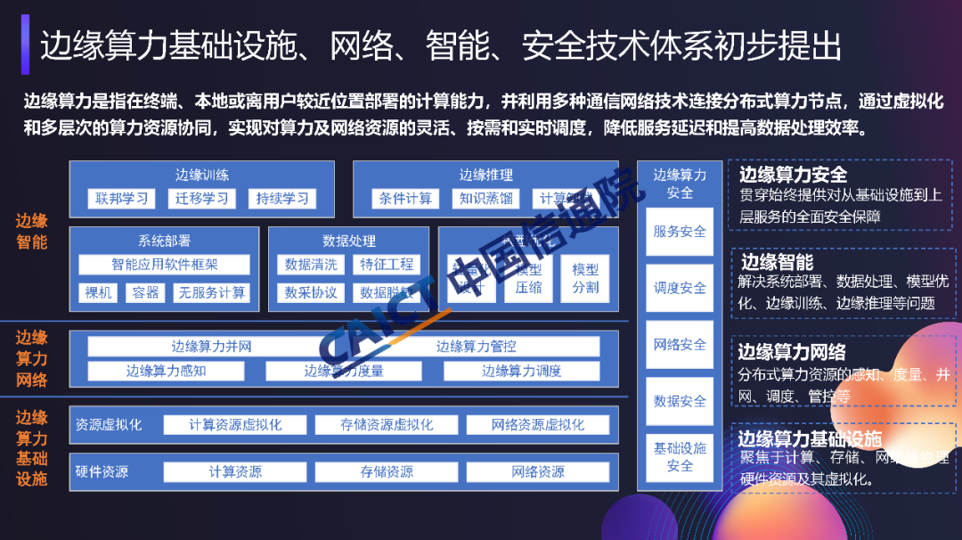 作為業(yè)界首個(gè)以邊緣算力為主題的研究報(bào)告,《邊緣算力藍(lán)皮書》系統(tǒng)闡述了邊緣算力整體發(fā)展態(tài)勢,凝練了邊緣算力資源異構(gòu)、網(wǎng)絡(luò)異構(gòu)、泛在分布、低時(shí)延、低成本、高隱私的六大關(guān)鍵特征;重點(diǎn)總結(jié)了邊緣算力基礎(chǔ)設(shè)施、邊緣算力網(wǎng)絡(luò)、邊緣智能以及邊緣算力安全四大關(guān)鍵技術(shù)方向;詳細(xì)梳理了邊緣算力在工業(yè)互聯(lián)網(wǎng)、智慧社區(qū)、軌道交通等垂直領(lǐng)域的應(yīng)用模式;提出了完善標(biāo)準(zhǔn)體系、加強(qiáng)基礎(chǔ)設(shè)施建設(shè)、推動(dòng)邊緣算力共享等發(fā)展建議,為推動(dòng)邊緣算力應(yīng)用落地提供理論支撐及實(shí)踐參考。