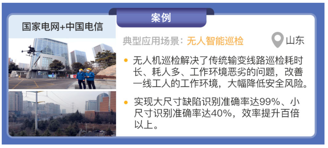 國家電網與中國電信合作,在山東省青島市開展“5G+北斗智能巡檢無人機”項目建設,實現了無人智能巡檢場景的應用。項目新建 5G 獨立組網(SA)網絡,完成了5G SA 專網的圖傳模塊的研發,引入北斗服務,實現無人機巡檢數據安全、實時、可靠回傳。解決了傳統輸變線路巡檢耗時長、耗人多、工作環境惡劣的問題,改善一線工人的工作環境,大幅降低安全風險。同時,采用圖像智能識別技術,實現無人機自主巡檢、圖像實時傳輸、缺陷智能識別、輔助決策輸出等功能,解決了困擾無人機巡檢操作難、回傳難、分析難的問題,大尺寸缺陷識別準確率達99%、小尺寸識別準確率達 40%,工作效率提升百倍以上。