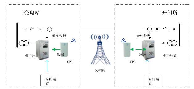 光纖差動保護采用專用光纖或復用2M光纖通道,路由相同且收發(fā)延時一致,采用乒乓法原理進行數(shù)據(jù)同步,不依賴外部時鐘同步。而5G差動保護采用5G網(wǎng)絡,通道延遲抖動較大,傳輸延時不固定,上下行通道延時不一致,需要采用類似變電站內組網(wǎng)SV采用的基于對時同步下的數(shù)據(jù)傳輸和采樣插值同步方案。當前階段,5G無線終端CPE不支持對時輸出,只能采用外部時鐘同步,通過外部授時系統(tǒng)(北斗和GPS授時)實現(xiàn)數(shù)據(jù)同步,配置如圖5-1所示。