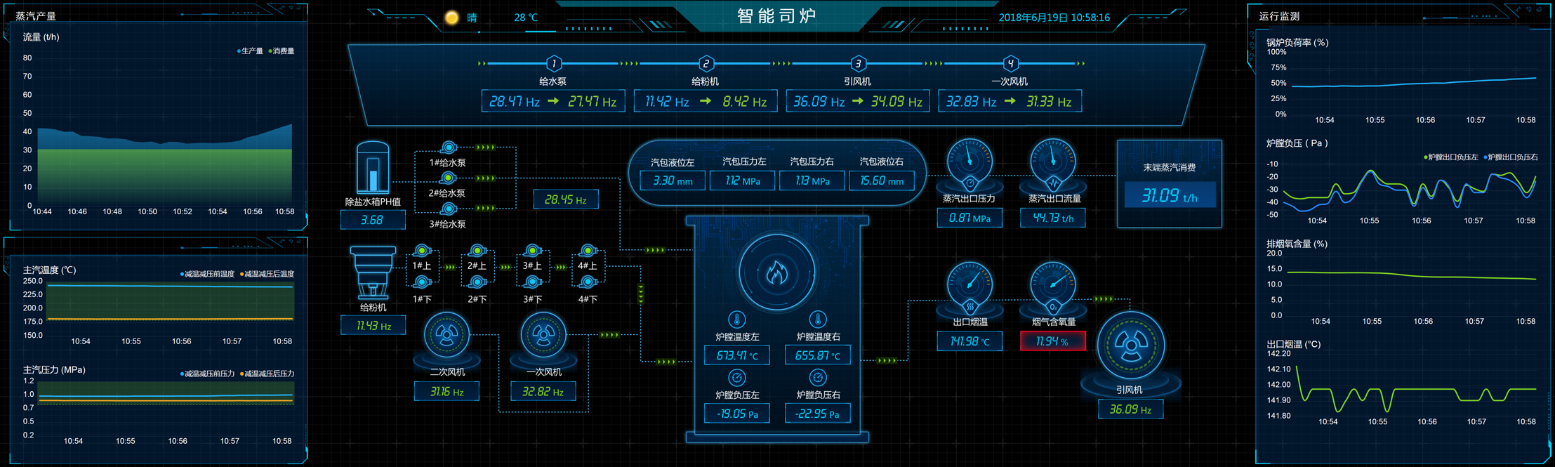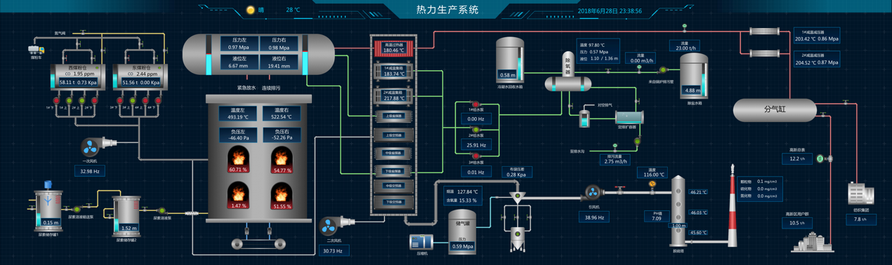 生產(chǎn)系統(tǒng)監(jiān)控應(yīng)該能夠提供對(duì)整個(gè)生產(chǎn)工藝過(guò)程的實(shí)時(shí)在線查看;能夠以組態(tài)圖的形式對(duì)化水的超濾、反滲透、混床,燃燒的水系統(tǒng)、鍋爐系統(tǒng),環(huán)保的除塵、脫硫、脫銷等工藝過(guò)程展示重要參數(shù)的實(shí)時(shí)指標(biāo),同時(shí)能夠以曲線的形式展示各項(xiàng)生產(chǎn)數(shù)據(jù)的實(shí)時(shí)趨勢(shì)和歷史變化過(guò)程。如下圖所示: