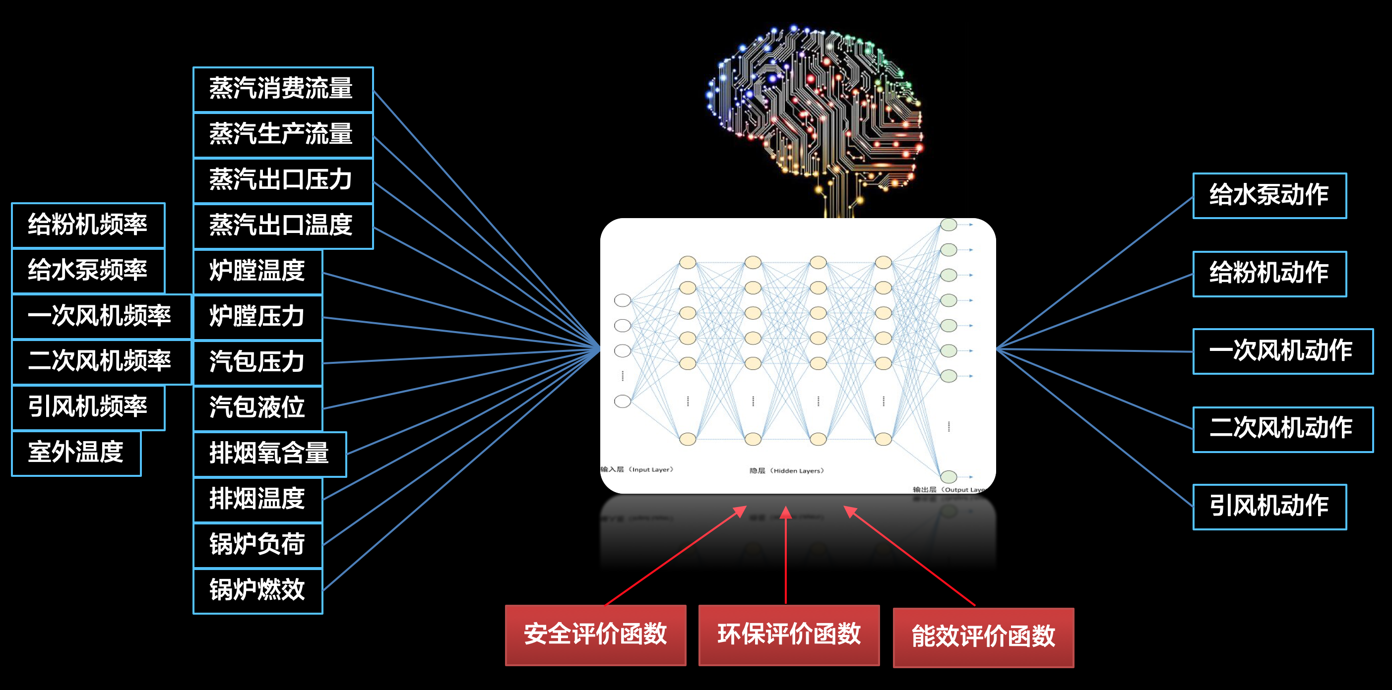 基于熱能生產(chǎn)關(guān)鍵生產(chǎn)工藝過(guò)程的歷史運(yùn)行數(shù)據(jù),對(duì)給粉機(jī)、鍋爐、管網(wǎng)等建立數(shù)字孿生和數(shù)據(jù)模型,能夠通過(guò)模型實(shí)時(shí)對(duì)最佳鍋爐參數(shù)進(jìn)行預(yù)測(cè),為司爐人員提供最優(yōu)的操作建議,對(duì)各種鍋爐控制進(jìn)行實(shí)時(shí)最優(yōu)化調(diào)整,包括:給粉機(jī)運(yùn)行數(shù)量、給粉機(jī)頻率、一次風(fēng)機(jī)頻率、二次風(fēng)機(jī)頻率、引風(fēng)機(jī)頻率、給水泵頻率、減溫減壓水開(kāi)度等。如下圖是基于深度學(xué)習(xí)的鍋爐控制模型: