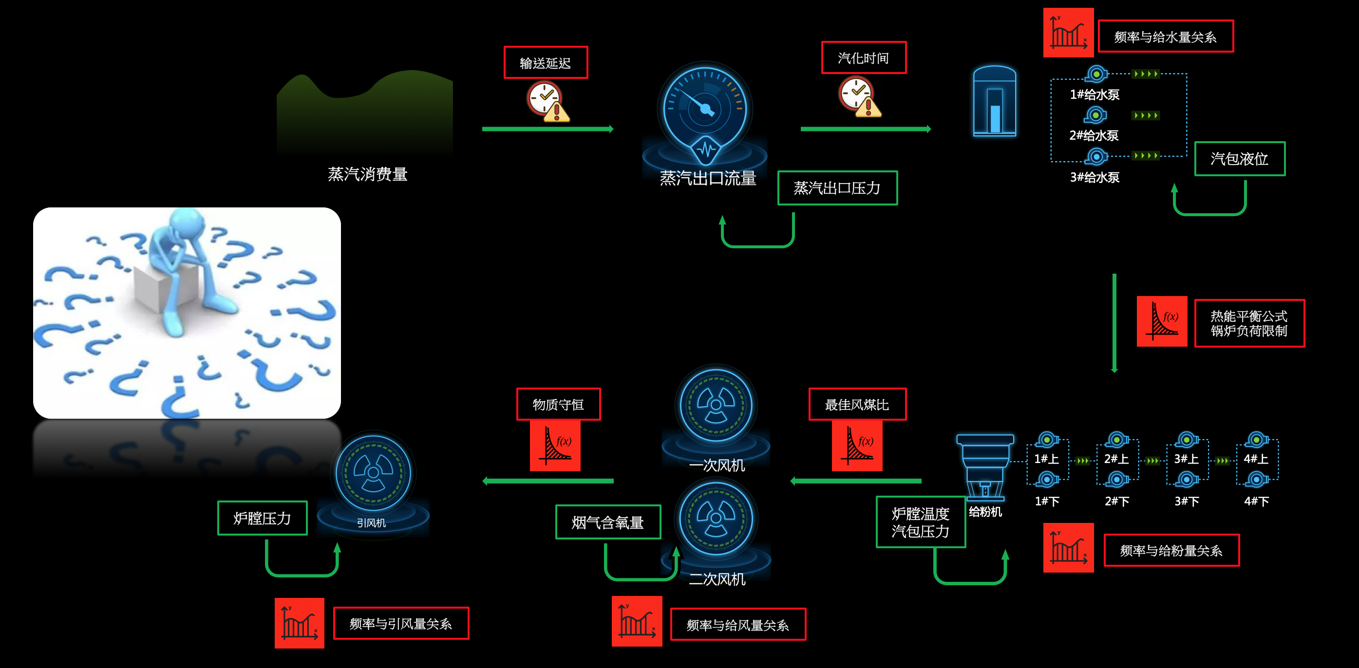 整個(gè)鍋爐控制過(guò)程是一個(gè)“非線性、強(qiáng)耦合、大延遲”的系統(tǒng),這種問(wèn)題對(duì)于人的理解和優(yōu)化操作是無(wú)法實(shí)現(xiàn)的,即使是使用基于機(jī)理的計(jì)算模型也很難計(jì)算的很清楚,如下圖展示了鍋爐控制的分解環(huán)節(jié)機(jī)器困難點(diǎn):