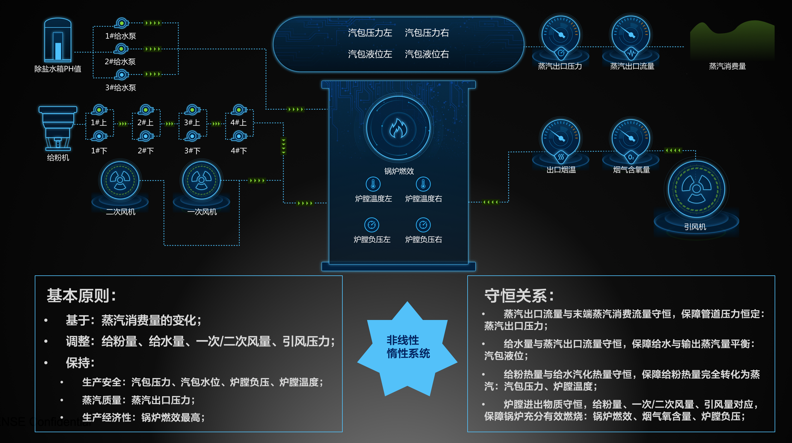 鍋爐的生產(chǎn)控制是整個(gè)熱能生產(chǎn)的核心環(huán)節(jié),也是最復(fù)雜的生產(chǎn)工藝過(guò)程,如下圖展示了鍋爐控制的核心抽象: