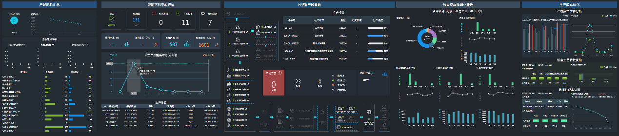 生產線狀態可視化展示,將整個產線級的生產狀態作總體呈現,其中包含產線設備加工過程模擬、設備告警信息的高亮顯示、當日產量與訂單信息和能耗總覽。總體看板也是其他分支功能模塊的總入口,可以通過點擊各信息進行不同維度的下鉆。主要內容包含: