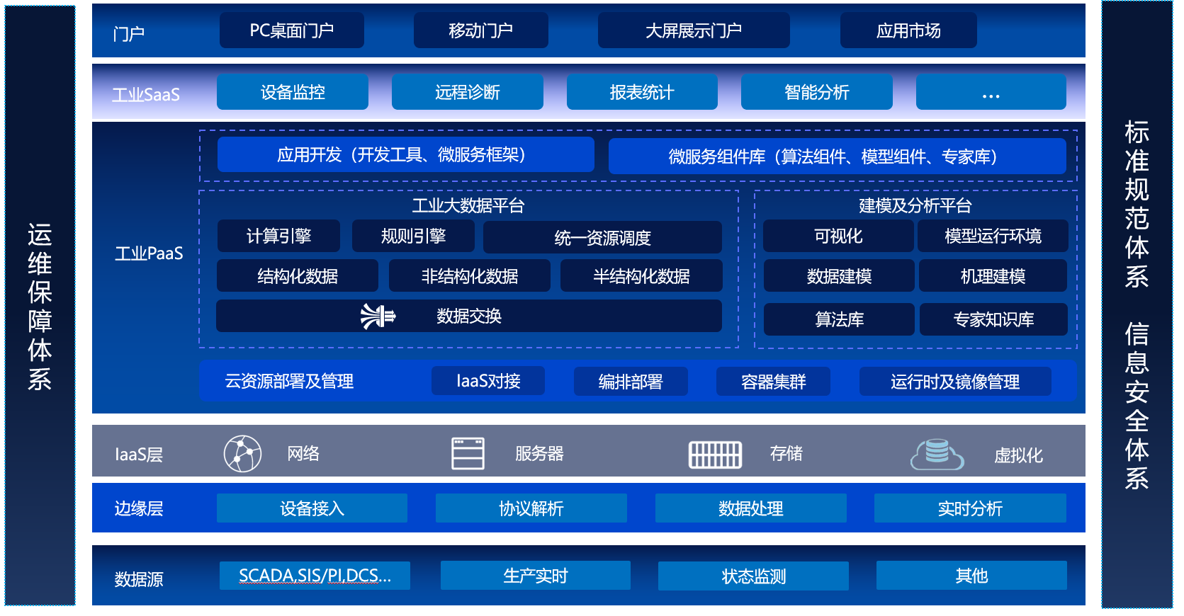 國網(wǎng)新源水電主設(shè)備實(shí)時分析監(jiān)測系統(tǒng)采用分布式、多層體系架構(gòu),自頂向下分為展示層、業(yè)務(wù)應(yīng)用層、平臺層、基礎(chǔ)層、接入層(采集層),建立在統(tǒng)一的標(biāo)準(zhǔn)規(guī)范體系、安全管理體系、運(yùn)維保障體系下。