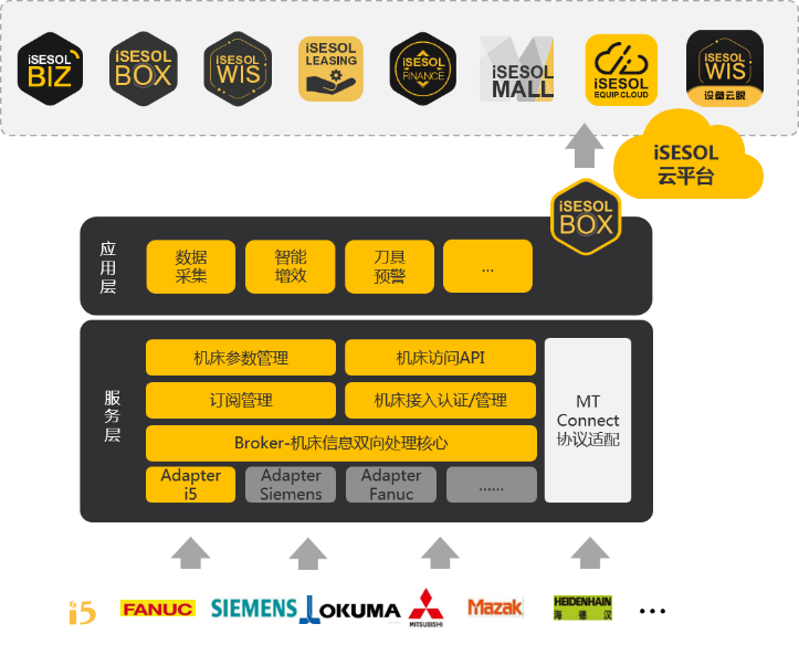 智能云科信息科技有限公司自主研發的邊緣計算網關——iSESOL BOX,具備工業協議適配、工業現場設備數據采集與邊緣計算能力,結合iSESOL工業互聯網平臺的云服務產品,形成“云+邊緣”的工業互聯網技術架構及服務能力,為機加工企業提供設備狀態監控、生產效率提升及設備全生命周期維護等能力支撐。