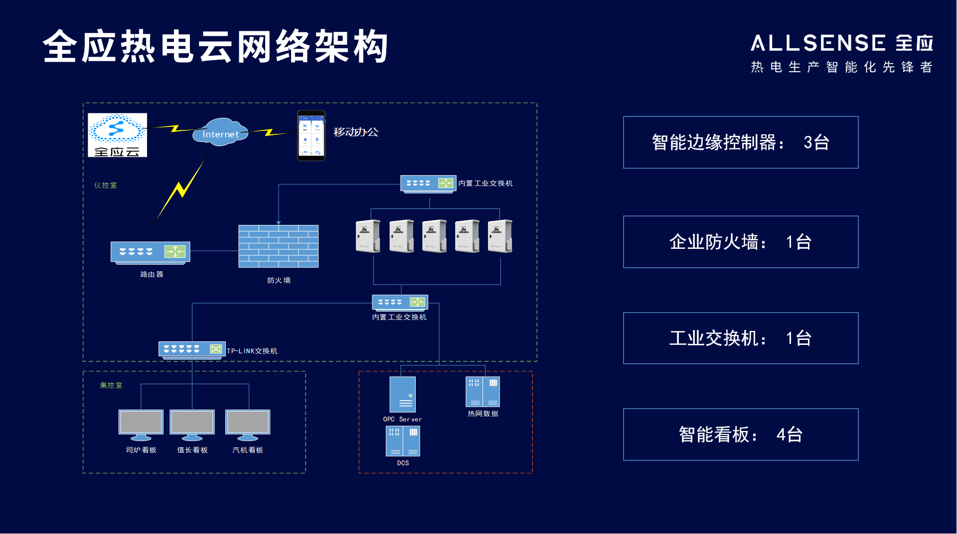 全應科技結合熱電廠實際情況,在熱電廠側共計部署智能邊緣控制器3臺,企業防火墻1臺,工業交換機1臺,智能看板4臺。既能提供熱電生產的智能化運行,又能確保熱電生產系統與外界隔離,確保熱電生產安全、穩定運行。