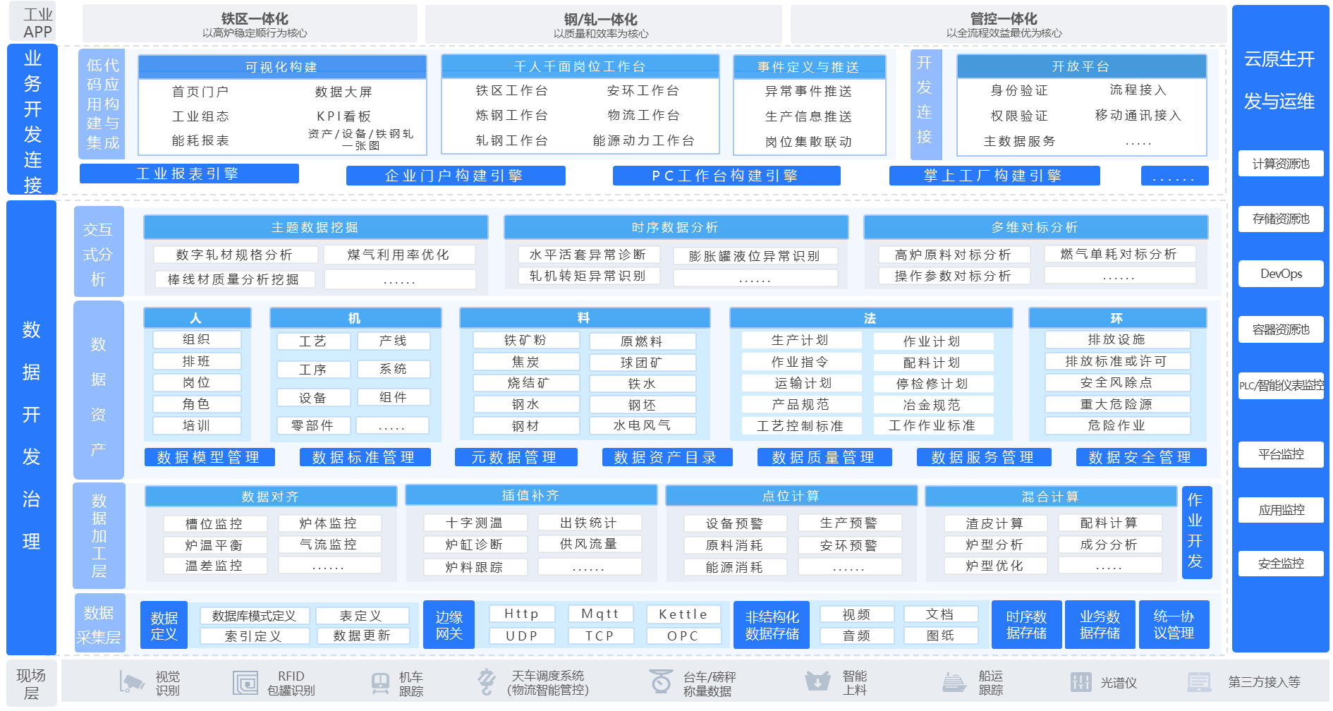 以鋼鐵領域經驗和工藝知識為基礎,以區域和“人機料法環”的維度進行數據和業務的梳理和組織,形成鋼鐵領域數據資產和事件總線,實現上層智能應用與底層的數據采集、集成的橫向解耦,和大型解決方案與具體功能點的縱向解耦,讓數據資產投入再生產并持續創造價值,賦能業務,構建智能制造有機體。