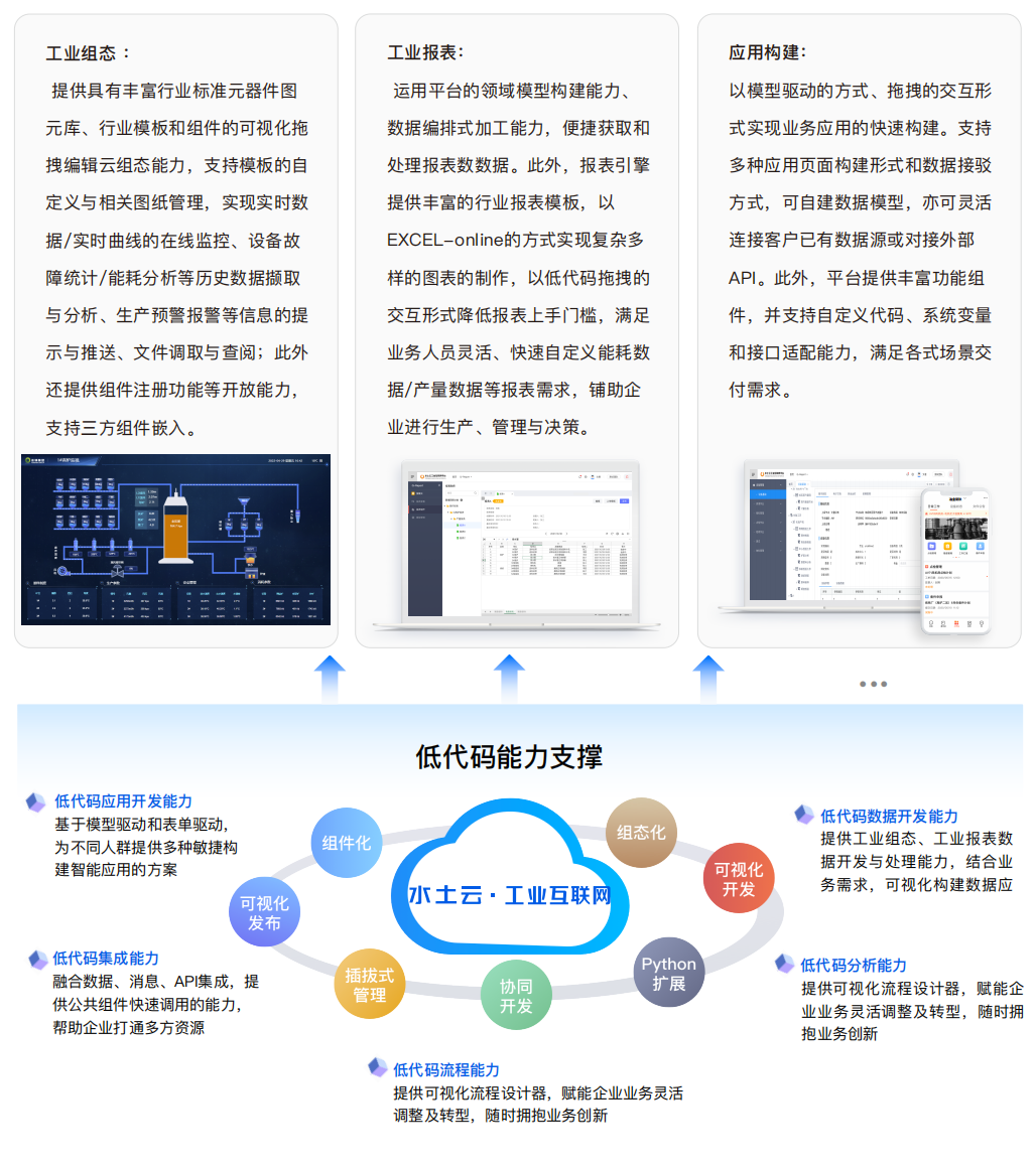 水土云工業互聯網平臺作為構建數字工廠信息化框架和基礎,主要由數據開發治理、業務開發連接、云原生開發運維三大板塊組成,實現工業知識、模型和歷史數據的沉淀,并面向工業場景提供業務與數據的共享服務體系,降低企業IT的重復建設、減少煙囪式協作成本、敏捷響應前端業務的快速變化。