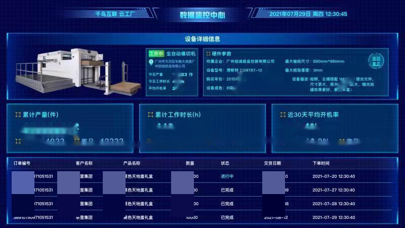 本項目充分利用根云平臺的物聯(lián)接入以及數(shù)據(jù)計算等能力,將印刷包裝設(shè)備連接呈現(xiàn),實現(xiàn)設(shè)備監(jiān)控、訂單監(jiān)控等功能,為千鳥四大業(yè)務提供數(shù)據(jù)支撐。