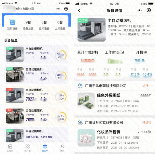 第一,訂單拆分。以具體訂單為例,為提高生產(chǎn)效率,縮短生產(chǎn)鏈條,對訂單按照最小顆粒度進行拆解。比方說美思天地蓋的包裝,共需要6個工藝,我們會將其拆成印刷、啞膜、開槽、裱、內(nèi)托、粘合等6個工藝,然后通過不同的協(xié)同工廠,一般是2-3家。之后再將生產(chǎn)設(shè)備連接至線上平臺,進行統(tǒng)一調(diào)度,組成新的生產(chǎn)線,按照先前確定好的價格開展生產(chǎn),從而提高企業(yè)對于閑置產(chǎn)能利用的同時,降低生產(chǎn)成本,在價格上形成競爭優(yōu)勢。