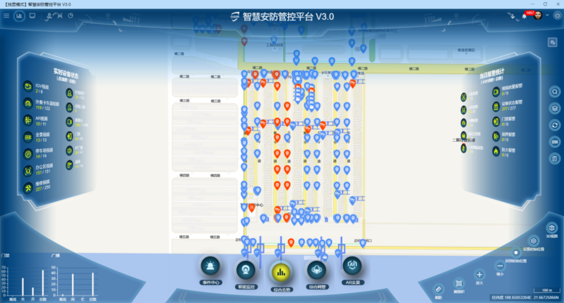 構建三港智慧安防業務“駕駛艙”,進行數據分類、統計分析、圖表數據展示,關鍵點位可以視頻實時輪巡方式顯示;