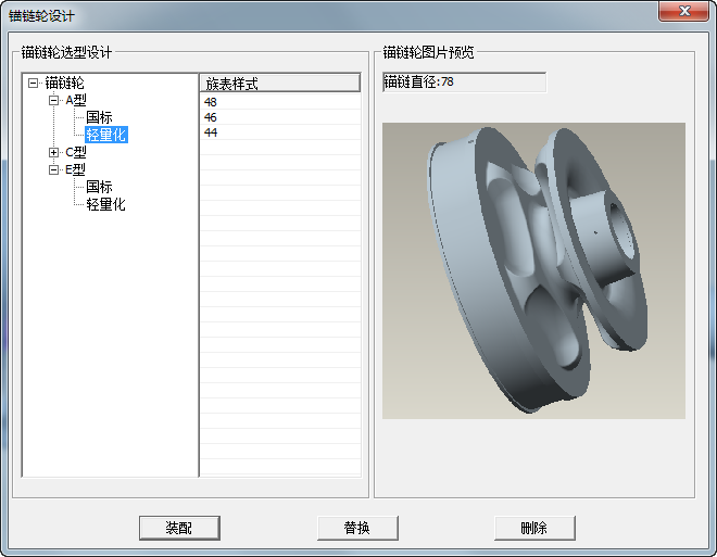 可選擇需要的錨鏈輪種類,錨鏈輪均為族表樣式,可進行新建裝配,替換選型以及刪除動作;可及時看到當前設計要求選用的錨鏈直徑是多少,可根據此數值作為選型參考;在此功能區,可自定義截圖作為選型參考。