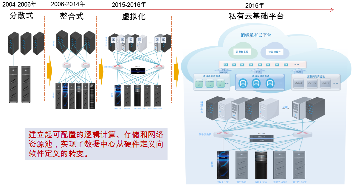 傳統(tǒng)工業(yè)模式與改造后新模式的對(duì)比描述 | 酒鋼信息中心依據(jù)云計(jì)算技術(shù)架構(gòu)和發(fā)展趨勢(shì),結(jié)合酒鋼實(shí)際情況,搭建完成甘肅省首家工業(yè)私有云平臺(tái),使得酒鋼數(shù)據(jù)中心真正從傳統(tǒng)數(shù)據(jù)中心轉(zhuǎn)型升級(jí)到綠色節(jié)能云數(shù)據(jù)中心。 酒鋼從傳統(tǒng)數(shù)據(jù)中心向云數(shù)據(jù)中心的發(fā)展演變圖如下: