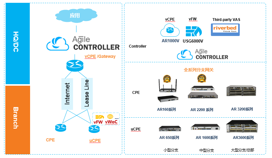 SD-WAN解決方案產品主要包含AC控制器、CPE/uCPE、vCPE、 VAS (vFW、第三方VAS)組成,各部件功能簡介如下: