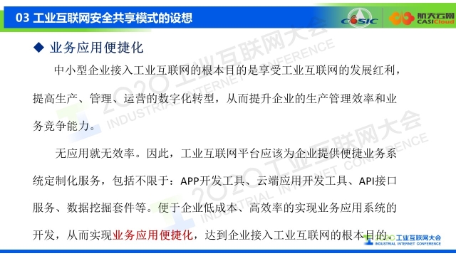 “中小企業接入工業互聯網的根本目的是享受工業互聯網的發展紅利,實現生產、管理、運營的數字化轉型,從而提升企業的生產管理效率和業務競爭能力。無應用就無效率,因此工業互聯網平臺應該為企業提供便捷業務定制化服務,包括不限于APP的開發工具、云端應用開發工具、API服務接口、數據挖掘套件等,便于企業低成本、高效率實現業務應用系統的開發,從而實現業務應用便捷化,達到企業接入工業互聯網的根本目的。”
