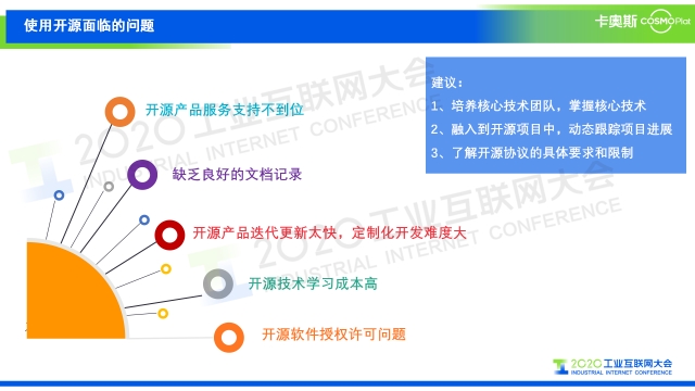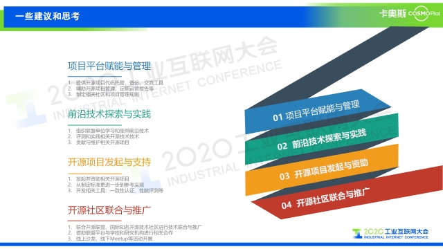 點(diǎn)擊下方鏈接,觀看演講視頻 專家說 “給大家一些在開源領(lǐng)域?qū)用娴慕ㄗh和思考。第一,項(xiàng)目平臺實(shí)現(xiàn)賦能與管理,要提供開源項(xiàng)目代碼托管、備份、交流的工具,通過一些工具來完善并且促進(jìn)我們開源項(xiàng)目的管理。第二,輔助開源項(xiàng)目管理,要定期關(guān)注運(yùn)營報(bào)告,同時(shí)要制定社區(qū)和整個(gè)項(xiàng)目的管理規(guī)則。第三,發(fā)起開源項(xiàng)目,支持開源項(xiàng)目,要從制定標(biāo)準(zhǔn)、開發(fā)工具,一致性認(rèn)證、性能測評等等方面來推進(jìn)。最后,開源社區(qū)的聯(lián)合與推廣,要做到產(chǎn)學(xué)研各個(gè)層面的聯(lián)合。開源不僅僅是源碼的開源,更重要的是我們要做到生態(tài)的建設(shè)。只有這樣,才能實(shí)現(xiàn)開源的真正推廣與落地。 以下是演講PPT 敬請閱讀
