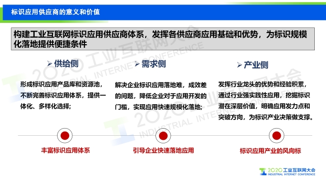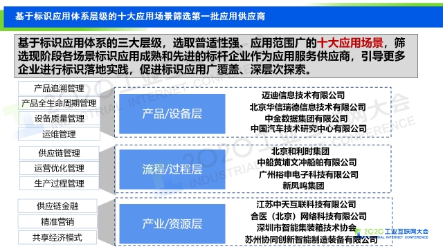 本次發布的工業互聯網標識應用供應商將提供應用產品方案規劃、應用方案設計、應用所需資源測算,標識應用技術支持、系統對接、軟硬件適配,標識應用運營計劃,標識解析應用建議、運營形式、成本審視及規劃等服務。