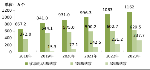 截至2023年底,全國移動通信基站總數達1162萬個,其中5G基站(注3)為337.7萬個,占移動基站總數的29.1%,占比較上年末提升7.8個百分點。
