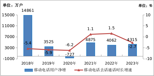 圖3-4 2018—2023年移動電話用戶和通話量增長情況