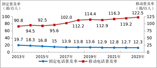圖2-1 2013—2023年固定電話及移動電話普及率發展情況