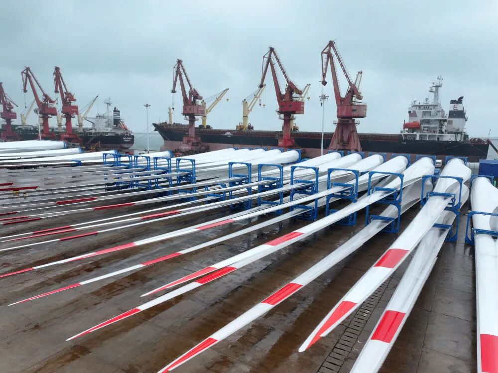 2025年10月13日,在江蘇省連云港港東方港務(wù)分公司碼頭,大批風(fēng)電設(shè)備集港準(zhǔn)備裝船出口國(guó)外(無(wú)人機(jī)照片)。新華社發(fā)(王春 攝)