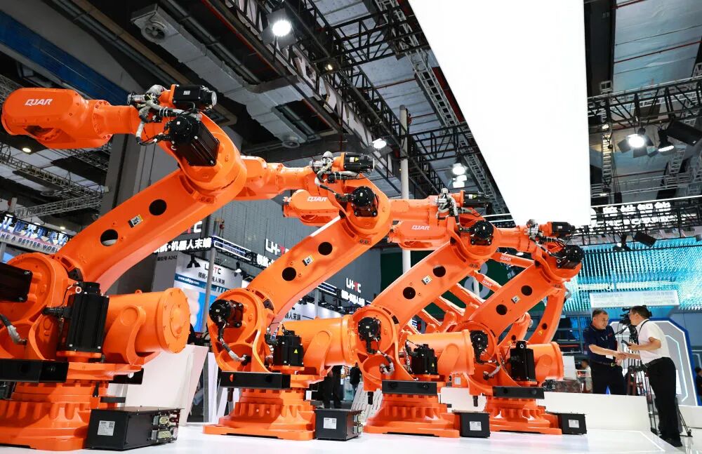 這是2025年9月23日在上海舉行的第25屆中國(guó)國(guó)際工業(yè)博覽會(huì)上拍攝的一組大型工業(yè)機(jī)器人產(chǎn)品。新華社記者 方喆 攝