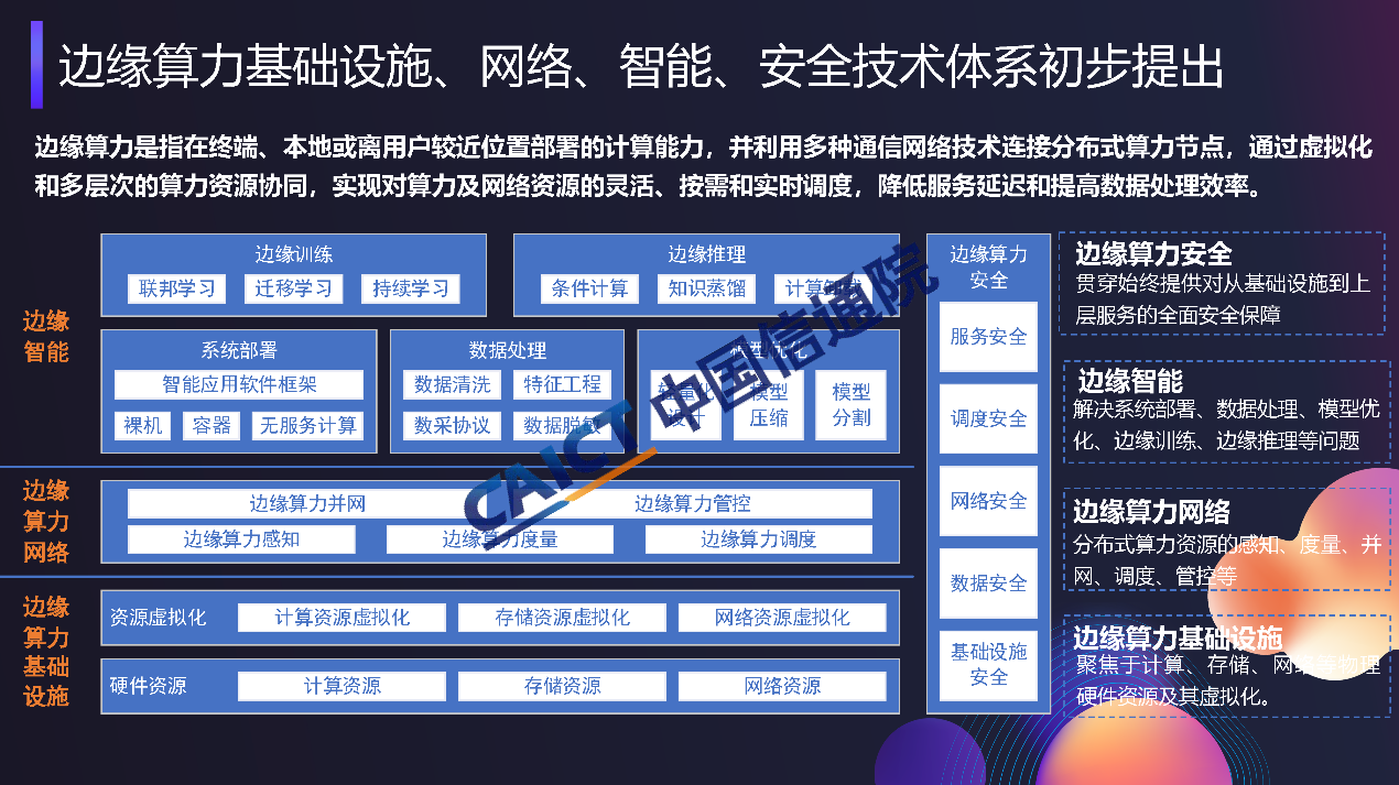 作為業(yè)界首個以邊緣算力為主題的研究報(bào)告,《邊緣算力藍(lán)皮書》系統(tǒng)闡述了邊緣算力整體發(fā)展態(tài)勢、關(guān)鍵特征、以及技術(shù)產(chǎn)業(yè)演進(jìn)趨勢等內(nèi)容,為推動邊緣算力應(yīng)用落地提供理論支撐及實(shí)踐參考。本藍(lán)皮書分為五部分:第一章從政策、標(biāo)準(zhǔn)及產(chǎn)業(yè)等三個維度全面分析了邊緣算力發(fā)展態(tài)勢;第二章總結(jié)了邊緣算力概念及關(guān)鍵特征;第三章提出了邊緣算力技術(shù)體系,詳細(xì)闡述了邊緣算力基礎(chǔ)資源設(shè)施、邊緣算力資源邊緣算力資源調(diào)度、邊緣算力運(yùn)維及邊緣算力安全等關(guān)鍵技術(shù)演進(jìn)趨勢;第四章剖析了工業(yè)互聯(lián)網(wǎng)、智慧社區(qū)、軌道交通等垂直領(lǐng)域邊緣算力應(yīng)用模式;第五章探討了邊緣算力未來發(fā)展方向,提出了完善標(biāo)準(zhǔn)體系、加強(qiáng)基礎(chǔ)設(shè)施建設(shè)、推動算力共享等建議。