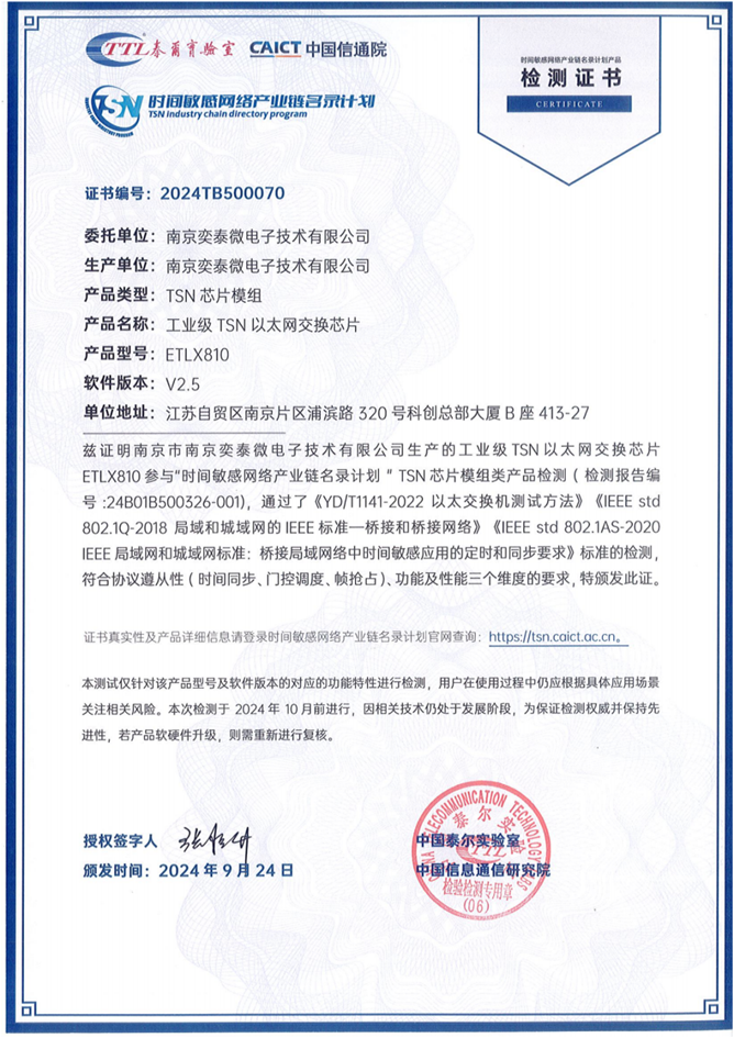 2024年9月,南京奕泰微電子技術有限公司(以下簡稱奕泰微)研發(fā)的ETL810型工業(yè)以太網TSN交換芯片,在互聯(lián)網與工業(yè)融合創(chuàng)新工信部重點實驗室順利通過名錄計劃產品評測,獲得芯片模組類檢測證書。