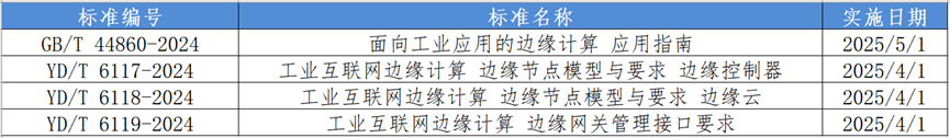 2024年9月20日,工信部印發(fā)《工業(yè)重點(diǎn)行業(yè)領(lǐng)域設(shè)備更新和技術(shù)改造指南》的通知,提出“部署邊緣計(jì)算節(jié)點(diǎn)、邊緣計(jì)算網(wǎng)關(guān)、邊緣控制器、邊緣云等工業(yè)算力設(shè)備”要求,明確“力爭到2027年,80%的規(guī)模以上制造業(yè)企業(yè)基本實(shí)現(xiàn)網(wǎng)絡(luò)化改造,邊緣網(wǎng)關(guān)、邊緣控制器等產(chǎn)品部署超過100萬臺”目標(biāo)。2024年10月26日,由機(jī)械工業(yè)儀器儀表綜合技術(shù)經(jīng)濟(jì)研究所、中國信息通信研究院(以下簡稱“中國信通院”)、中國科學(xué)院沈陽自動化研究所等聯(lián)合牽頭的《面向工業(yè)應(yīng)用的邊緣計(jì)算 應(yīng)用指南》國家標(biāo)準(zhǔn)正式發(fā)布。2024年12月25日,《工業(yè)互聯(lián)網(wǎng)邊緣計(jì)算 邊緣節(jié)點(diǎn)模型與要求 邊緣控制器》、《工業(yè)互聯(lián)網(wǎng)邊緣計(jì)算 邊緣節(jié)點(diǎn)模型與要求 邊緣云》、《工業(yè)互聯(lián)網(wǎng)邊緣計(jì)算 邊緣網(wǎng)關(guān)管理接口要求》等3項(xiàng)工業(yè)互聯(lián)網(wǎng)邊緣計(jì)算行業(yè)標(biāo)準(zhǔn)正式發(fā)布。