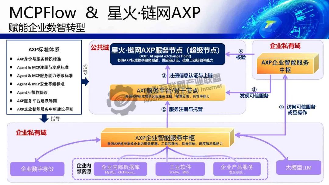 賀松介紹,基于MCP協議的AI落地解決方案,解決企業數字化轉型兩大痛點:1)業務語境缺失——通過標準化接口注入訂單狀態、客戶信息等上下文,使大模型精準理解業務語義;2)數據孤島問題——MCPFlow平臺集成ERP、CRM等系統工具鏈,實現"搭積木式"AI服務調用,將開發周期縮短70%。結合中國信通院"星火鏈網"構建可信AI智能體交換中心(ASP),確保內外數據安全互通。該方案推動大模型從概念走向業務控制,實現人機協同決策,形成開放AI生態