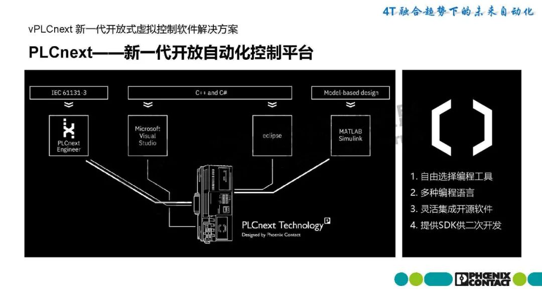 作為新一代的開放式控制平臺(tái),PLCnext允許用戶自由選擇適合他們需求的開發(fā)工具和技術(shù),來自不同背景的開發(fā)人員可以使用不同編程語言和編程工具,諸如IEC61131標(biāo)準(zhǔn)中的梯形圖、功能塊等,也可以使用C#/C++等高級(jí)語言,甚至MATLAB/simulink等模型語言彼此獨(dú)立開發(fā)控制器程序,提高協(xié)同開發(fā)的效率。并可以集成開源軟件更好的吸收當(dāng)下最新的技術(shù)成果,豐富的開放式接口為開發(fā)復(fù)雜的功能算法應(yīng)用提供更多可能性。