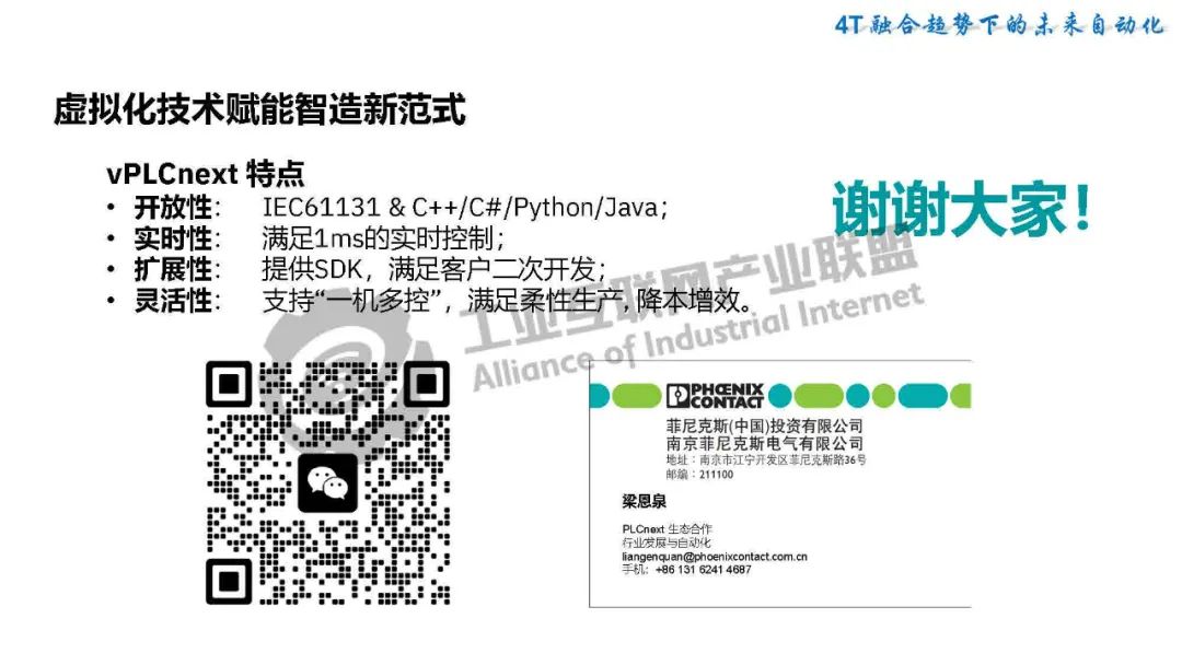 5月21日,在2025工業(yè)互聯(lián)網(wǎng)大會(huì)“工業(yè)互聯(lián)網(wǎng)數(shù)智融合創(chuàng)新發(fā)展專題活動(dòng)”上,菲尼克斯電氣中國公司PLCnext軟件業(yè)務(wù)與生態(tài)經(jīng)理梁恩泉發(fā)表了《虛擬控制技術(shù)賦能智造新范式》的主題演講。
