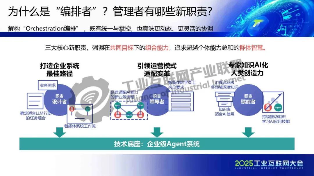 程莉介紹,AI Agent(智能體)可以在人類控制下進行自主行動或人機協同執行任務,人類作為AI的“編排者”,既有統一目標的掌控力,也意味著動態靈活的協調力。其三大核心職責是:
