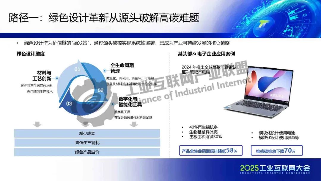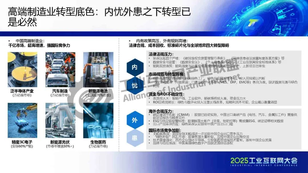 王輝介紹,中國(guó)高端制造業(yè)在數(shù)字化與綠色化協(xié)同轉(zhuǎn)型中面臨內(nèi)憂外患:國(guó)內(nèi)政策約束、國(guó)際碳壁壘、行業(yè)降本壓力及龍頭競(jìng)爭(zhēng)倒逼。當(dāng)前能碳管理粗放,數(shù)字化水平普遍偏低,且存在“能碳割裂”問(wèn)題,能源與碳管理分屬不同部門(mén),數(shù)據(jù)協(xié)同困難。轉(zhuǎn)型路徑聚焦綠色產(chǎn)品創(chuàng)新、核心工藝節(jié)能、端到端能源精細(xì)化管理、碳雙控拉通及產(chǎn)業(yè)鏈協(xié)同等五大方向。實(shí)踐案例顯示,通過(guò)AI+數(shù)字化工具優(yōu)化供應(yīng)鏈、光儲(chǔ)充集成及工藝革新,單產(chǎn)能耗可降40%,碳稅轉(zhuǎn)為碳資產(chǎn)收益。未來(lái)需打破組織壁壘,以數(shù)據(jù)驅(qū)動(dòng)實(shí)現(xiàn)能碳一體化,推動(dòng)高端制造業(yè)綠色競(jìng)爭(zhēng)力升級(jí)。