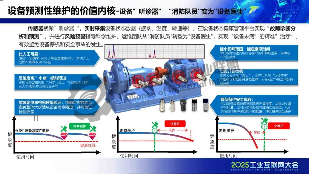 傳感器就像”聽診器“,實(shí)時(shí)采集設(shè)備狀態(tài)數(shù)據(jù),在設(shè)備狀態(tài)健康管理平臺(tái)實(shí)現(xiàn)“故障診斷分析和預(yù)測”,并進(jìn)行風(fēng)險(xiǎn)預(yù)警指導(dǎo)科學(xué)維護(hù),運(yùn)維團(tuán)隊(duì)從"消防隊(duì)員"轉(zhuǎn)型為"設(shè)備醫(yī)生",實(shí)現(xiàn)“設(shè)備未病”的精準(zhǔn)”治療”,有效避免設(shè)備停機(jī)和安全事故的發(fā)生。