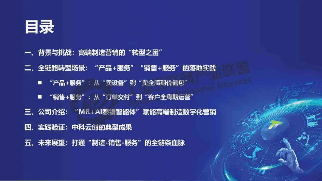 王哲介紹,中科云創(chuàng)針對高端制造營銷轉(zhuǎn)型困境,提出"產(chǎn)品+服務(wù)"和"銷售+服務(wù)"全鏈路解決方案,推動從單純賣設(shè)備向全周期價值服務(wù)升級,通過"MR+AI眼鏡智能體"技術(shù)賦能,實現(xiàn)從訂單交付到客戶全周期運營的數(shù)字化營銷轉(zhuǎn)型,典型實踐驗證了其有效性,未來將致力于打通"制造-銷售-服務(wù)"全鏈條協(xié)同。