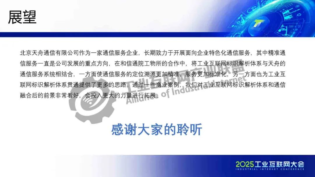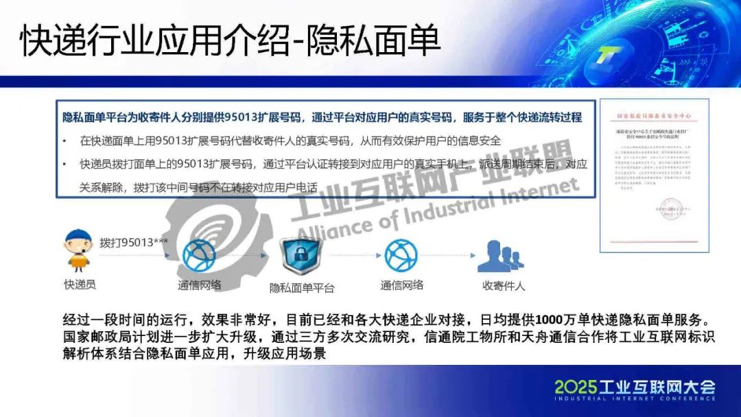 5月23日,在2025工業互聯網大會“工業互聯網標識解析貫通專題活動”上,北京天舟通信有限公司副總經理孫大成發表了《基于“標識+號碼呼叫”的郵政快遞行業數據管理及應用》的主題演講。