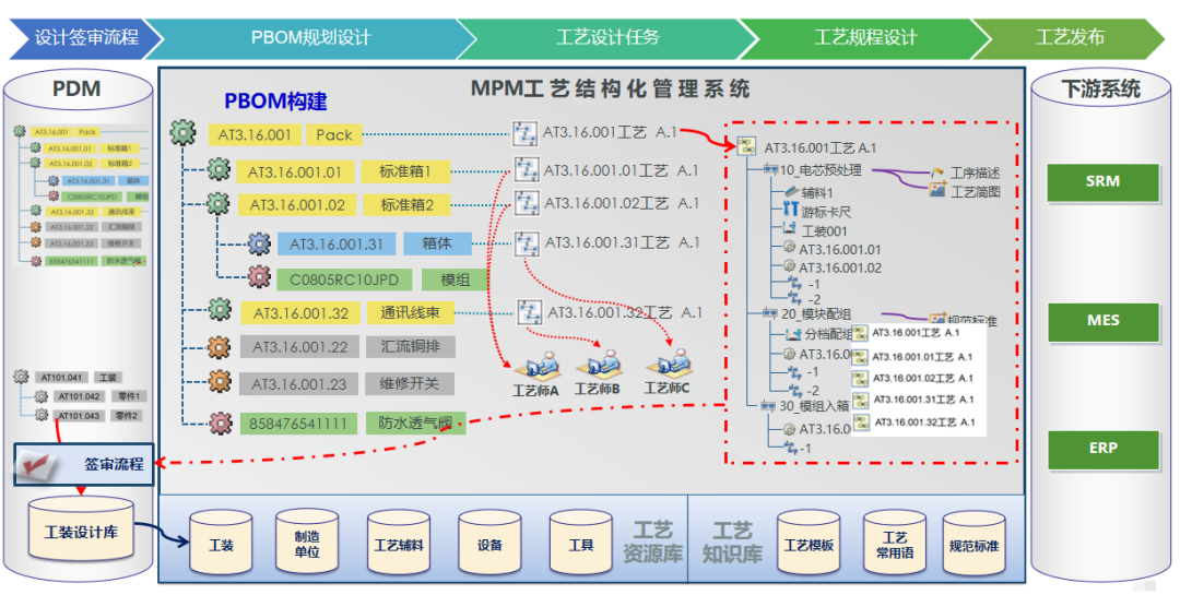 場(chǎng)景描述:以工藝平臺(tái)為載體,結(jié)構(gòu)化管理工藝資源數(shù)據(jù),向上對(duì)接研發(fā)數(shù)據(jù)管理的PLM,向下對(duì)接MES、ERP、SRM等系統(tǒng),實(shí)現(xiàn)研發(fā)-工藝-制造的全數(shù)字化流程貫通,打破跨部門協(xié)作的壁壘,有效支撐研發(fā)設(shè)計(jì)與工藝更改協(xié)同,確保工藝更改閉環(huán),提升鋰電池生產(chǎn)效率。