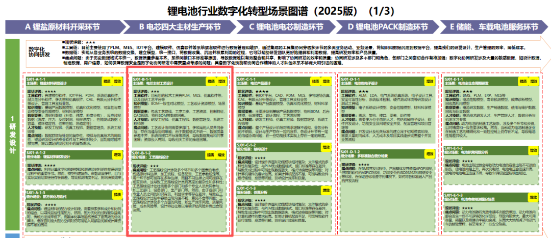工業(yè)和信息化部9月16日印發(fā)《場(chǎng)景化、圖譜化推進(jìn)重點(diǎn)行業(yè)數(shù)字化轉(zhuǎn)型的參考指引(2025版)》,其附件中給出14個(gè)行業(yè)場(chǎng)景圖譜(2025版),為各行業(yè)數(shù)字化轉(zhuǎn)型應(yīng)用實(shí)踐提供了方法指引。鋰電池行業(yè)數(shù)字化轉(zhuǎn)型場(chǎng)景圖譜涉及研發(fā)設(shè)計(jì)、生產(chǎn)制造、運(yùn)維服務(wù)、經(jīng)營(yíng)管理、供應(yīng)鏈管理等5個(gè)關(guān)鍵環(huán)節(jié)、73個(gè)典型場(chǎng)景。現(xiàn)對(duì)鋰電池行業(yè)的典型場(chǎng)景進(jìn)行解讀。