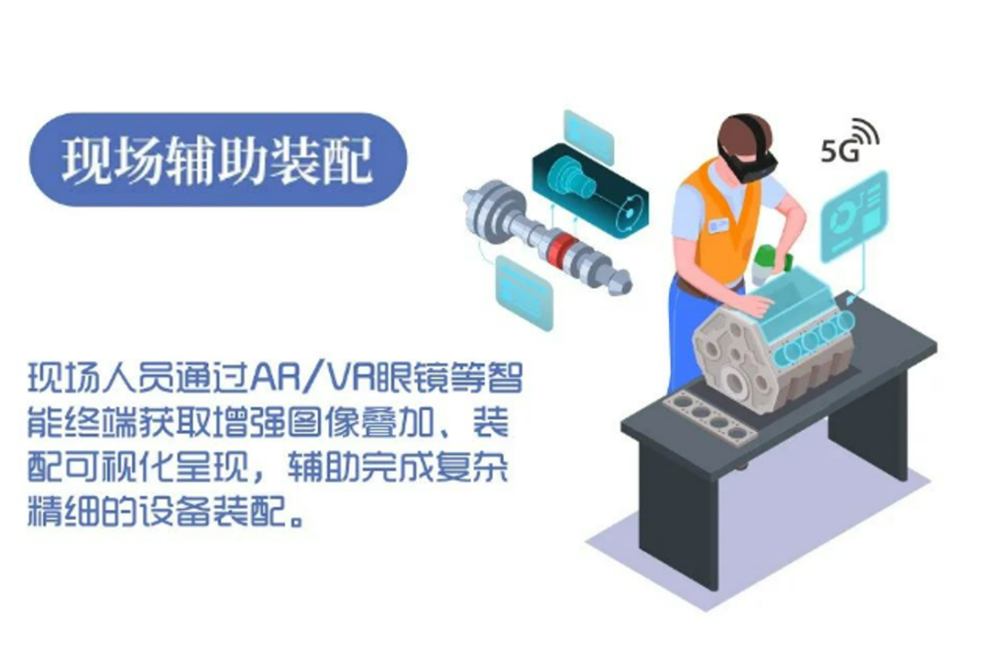 通過內(nèi)置 5G 模組或部署5G網(wǎng)關(guān)等設(shè)備,實(shí)現(xiàn) AR/VR 眼鏡、智能手機(jī)、PAD 等智能終端的5G網(wǎng)絡(luò)接入,采集現(xiàn)場(chǎng)圖像、視頻、聲音等數(shù)據(jù),通過5G網(wǎng)絡(luò)實(shí)時(shí)傳輸至現(xiàn)場(chǎng)輔助裝配系統(tǒng),系統(tǒng)對(duì)數(shù)據(jù)進(jìn)行分析處理,生成生產(chǎn) 4 輔助信息,通過 5G 網(wǎng)絡(luò)下發(fā)至現(xiàn)場(chǎng)終端,實(shí)現(xiàn)操作步驟的增強(qiáng)圖像疊加、裝配環(huán)節(jié)的可視化呈現(xiàn),幫助現(xiàn)場(chǎng)人員進(jìn)行復(fù)雜設(shè)備或精細(xì)化設(shè)備的裝配。另外,專家的指導(dǎo)信息、設(shè)備操作說明書、圖紙、文件等也可以通過5G網(wǎng)絡(luò)實(shí)時(shí)同步到現(xiàn)場(chǎng)終端,現(xiàn)場(chǎng)裝配人員簡(jiǎn)單培訓(xùn)后即可上崗,有效提升現(xiàn)場(chǎng)操作人員的裝配水平,實(shí)現(xiàn)裝配過程智能化,提升裝配效率。