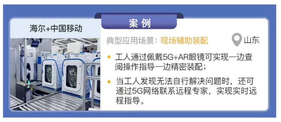 海爾與中國移動(dòng)合作,在山東省青島市利用5G技術(shù)實(shí)現(xiàn)了精密工業(yè)裝備的現(xiàn)場(chǎng)輔助裝配場(chǎng)景的應(yīng)用。青島海爾家電工廠結(jié)合海爾卡奧斯工業(yè)互聯(lián)網(wǎng)平臺(tái),打造基于5G+MEC 的互聯(lián)工廠,開展了基于AR 眼鏡的5G遠(yuǎn)程輔助裝配,工人通過佩戴 AR 眼鏡采集關(guān)鍵工業(yè)裝備的現(xiàn)場(chǎng)視頻,同時(shí)從后臺(tái)系統(tǒng)調(diào)取產(chǎn)品安裝指導(dǎo)推送到AR眼鏡上,實(shí)現(xiàn)了一邊查閱操作指導(dǎo)一邊裝配的目的。當(dāng)工人發(fā)現(xiàn)無法自行 9 解決問題時(shí),還可以通過 5G 網(wǎng)絡(luò)聯(lián)系遠(yuǎn)程專家,實(shí)現(xiàn)實(shí)時(shí)遠(yuǎn)程指導(dǎo)。另外,通過將算力部署在MEC 側(cè),降低了AR眼鏡算力要求與眼鏡重量,實(shí)現(xiàn)數(shù)據(jù)的本地計(jì)算,保障視頻數(shù)據(jù)不出園區(qū),一方面解決了以往Wi-Fi 連接產(chǎn)生的信號(hào)不穩(wěn)定、暈眩感和 AR 眼鏡偏重的困擾,另一方面也節(jié)省了維修時(shí)間和成本。