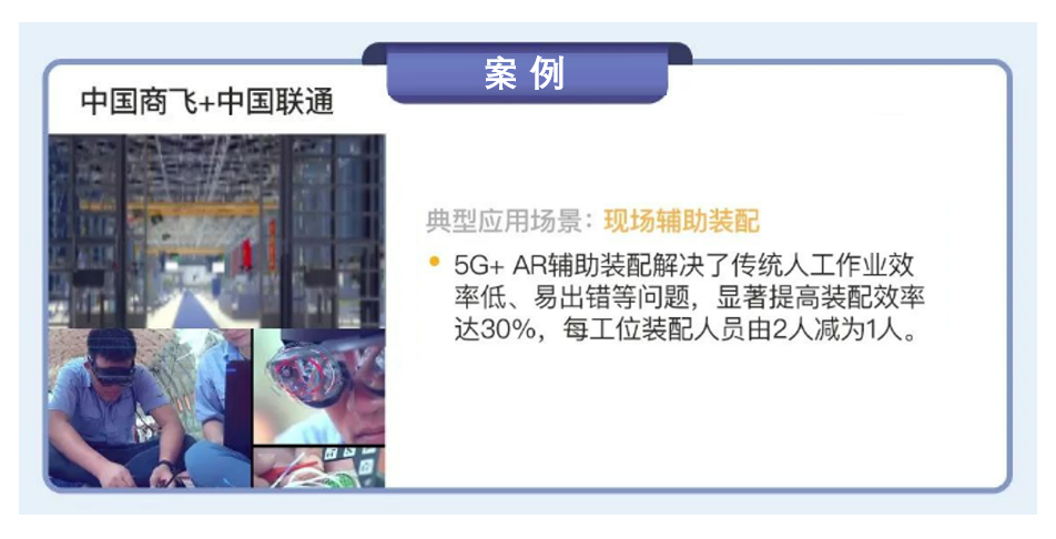 中國商飛與中國聯(lián)通合作,在上海浦東新區(qū)開展了“5G+工業(yè)互聯(lián)網(wǎng)賦能大飛機(jī)智能制造”項(xiàng)目建設(shè),搭建了 5 座宏基站和 150 余套室分小站,實(shí)現(xiàn)了現(xiàn)場(chǎng)輔助裝配場(chǎng)景的應(yīng)用。在現(xiàn)場(chǎng)輔助裝配方面,商飛在裝配車間中存在大量飛機(jī)線纜連接器裝配工作的工位,通過引入 5G+AR 輔助裝配系統(tǒng),工人利用AR虛擬信息實(shí)現(xiàn)虛實(shí)疊加,根據(jù)顯示的指導(dǎo)畫面完成裝配操作。通過 5G 高速率和低時(shí)延特性,讓工人準(zhǔn)確、快速地對(duì) 12 線纜連接器進(jìn)行查找和裝配,并保障數(shù)據(jù)的有效性,解決了傳統(tǒng)人工作業(yè)效率低、容易出錯(cuò)等問題,顯著提高了裝配效率達(dá) 30%,每工位所需裝配人員由2 人減少為1 人。