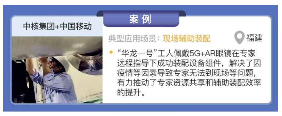 中核集團(tuán)與中國移動(dòng)合作,在福建省福清開展5G+核電項(xiàng)目建設(shè),實(shí)現(xiàn)了現(xiàn)場(chǎng)輔助裝配場(chǎng)景的應(yīng)用。在“華龍一號(hào)”六號(hào)機(jī)組的裝配建設(shè)現(xiàn)場(chǎng),通過5G專網(wǎng)+AR等技術(shù),工人佩戴 AR 眼鏡在專家遠(yuǎn)程指導(dǎo)下成功裝配設(shè)備組件,解決了因疫情等因素導(dǎo)致專家無法到現(xiàn)場(chǎng)等問題,有力推動(dòng)了專家資源共享和輔助裝配效率的提升。