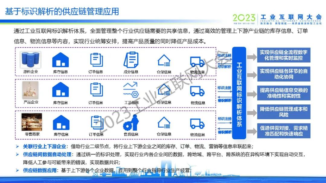 通過工業互聯網標識解析體系,全面管理整個行業供應鏈需要的共享信息,高效管理上下游產業鏈的庫存信息、訂單信息、物流信息等內容,實現行業統籌安排,提高產品質量的同時降低產品成本。實現行業上下游企業關聯:借助行業二級節點,將行業上下游企業之間的庫存、訂單、物流、營銷等信息串聯起來;實現供應鏈間數據自動處理:通過統一的標識處理,行業內各企業間的數據,跨地域、跨平臺、跨系統的在異構環境下實現自動交互,降低人工參與可能帶來的錯誤,實現數據共識;實現供應鏈數據應用:基于上下游各個企業數據,應用到整個行業指導行業生產經營。